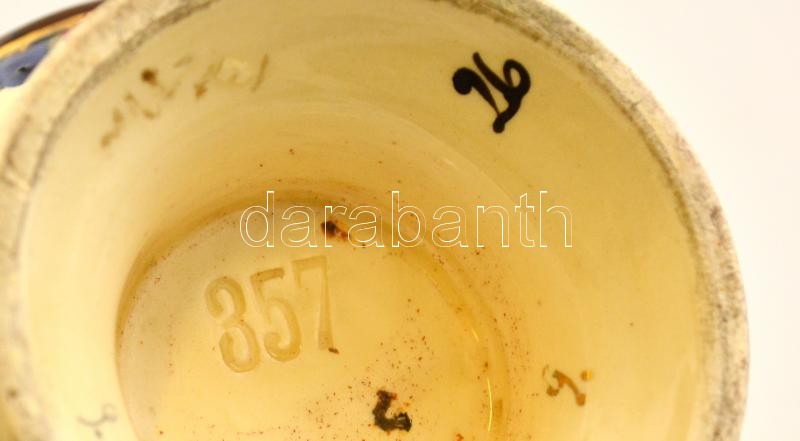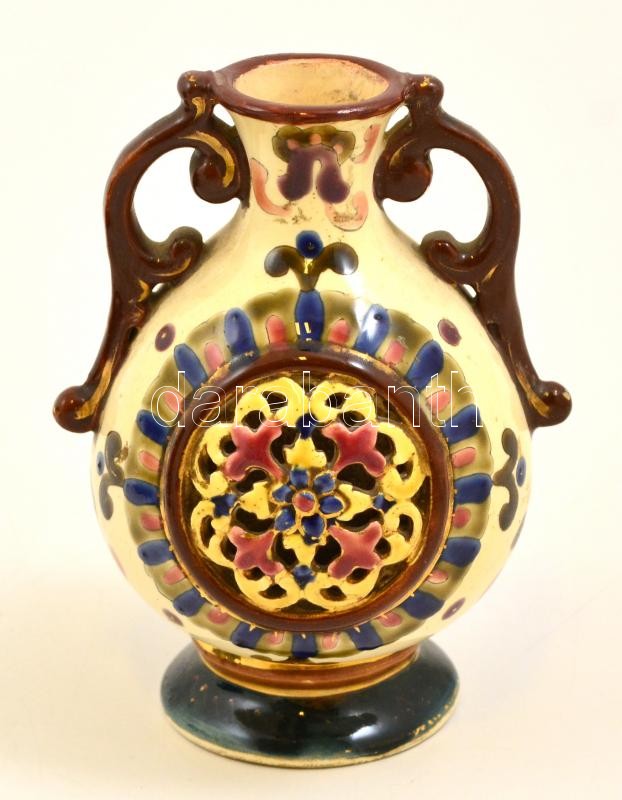 Leírás: Áttört füles váza, kézzel festett porcelán fajansz, márkajelzés nélkül, formaszámmal (357), m:12,5 cm