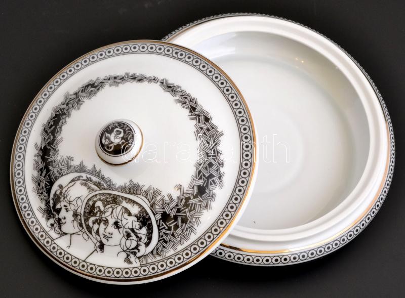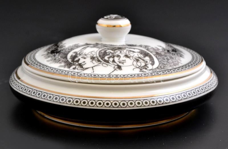 Leírás: Hollóházi Jurcsák László által tervezett mintával díszített porcelán bonbonier, matricás, jelzett, hibátlan, d: 14,5 cm