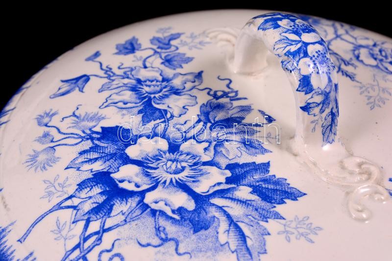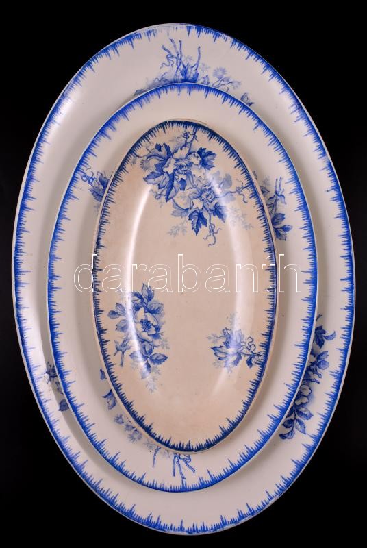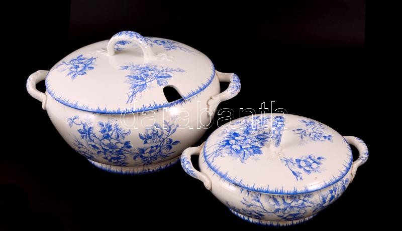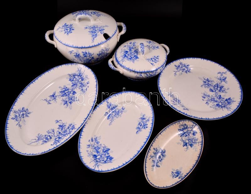Leírás: Societe Ceramique szecessziós levestál ( 2db), tálak (4db), levonókepés, kopottak egyiken hajszál repedéssel, jelzett, 24×14-38×22 cm, összesen:6 db