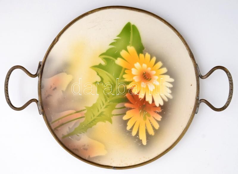 Leírás: XIX. sz. vége: Fajansz, virágmintás, réz tálca. Formaszámos. d:25 cm