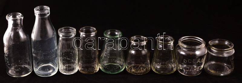 Leírás: 9 db különféle feliratos érdekes üvegpalack, apró csorbákkal, különböző méretben
