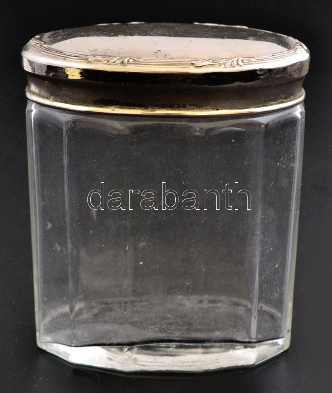 Leírás: Üveg fűszertartó, fém fedővel, csorbával, m: 8,5 cm