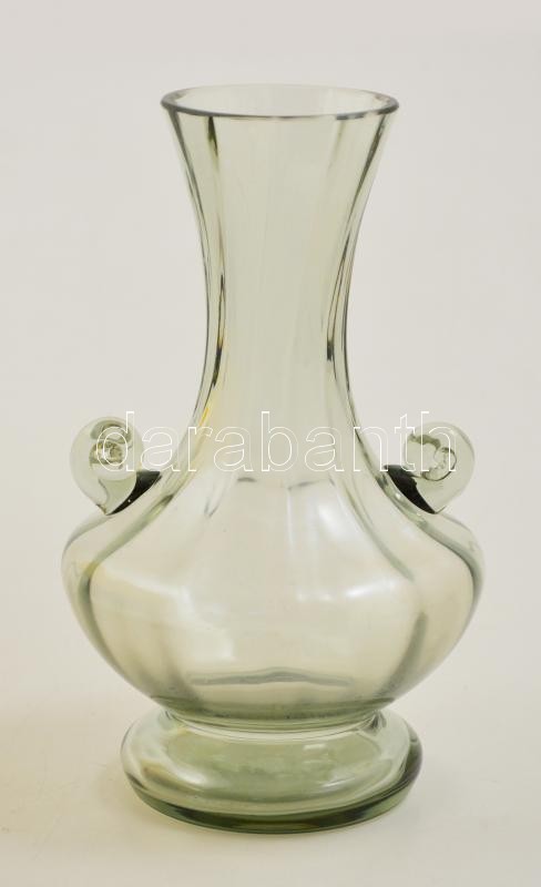 Leírás: halványszürke üveg váza, csiga díszítéssel, kopásnyomokkal, m: 17 cm