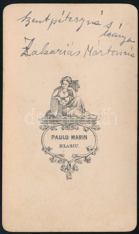 Leírás: cca 1865 Szentpéteryné és lánya Zakariás Mártonné, hátoldalon feliratozott keményhátú fotó Paulu Marin (Blasiu) műterméből, 10,5×6 cm