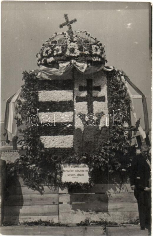 1940 Nagyvárad, Oradea; bevonulás emlékére virágokból készített magyar címer, Nemes János kertész alkotása / entry of the Hungarian troops, coat of arms made of flowers, photo