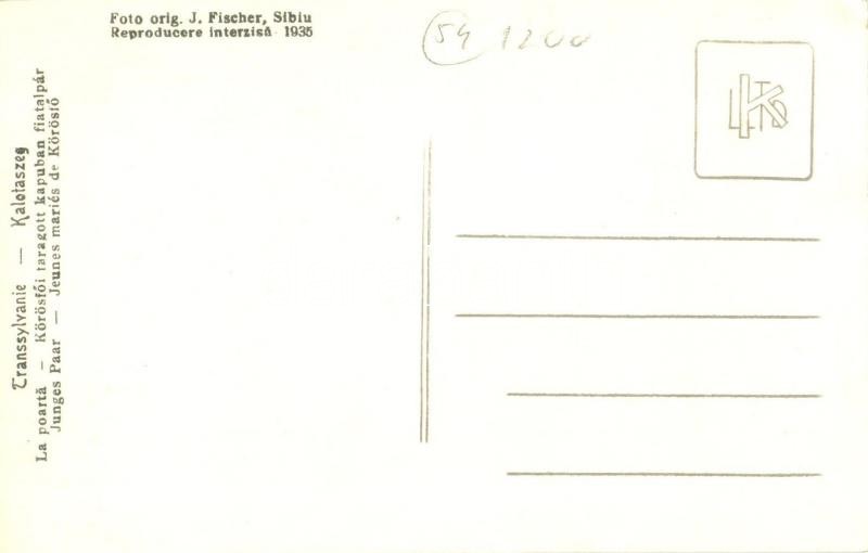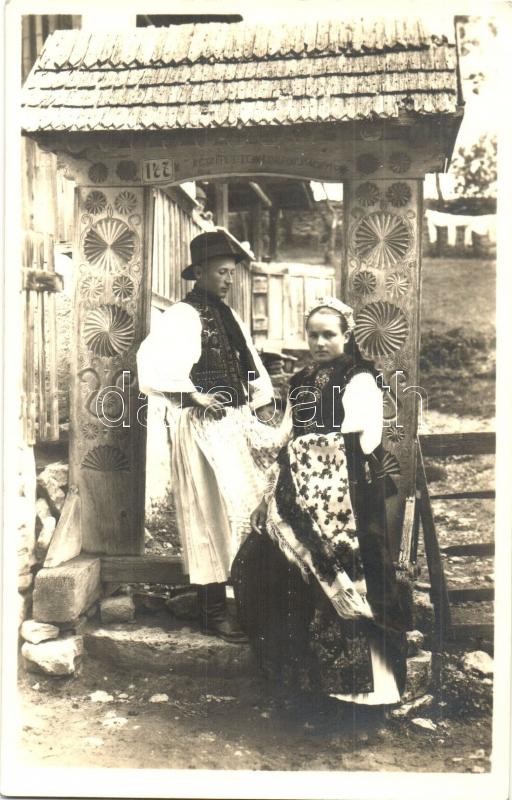 Körösfő, Izvoru Crisului (Kalotaszeg, Tara Calatei); Körösfői fiatal pár faragott kapuban (székelykapu), folklór, népviselet / Poarta secuiasca / Székely gate, Transylvanian folklore, young bride and groom in traditional costumes. Foto J. Fischer, Sibiu (EK)