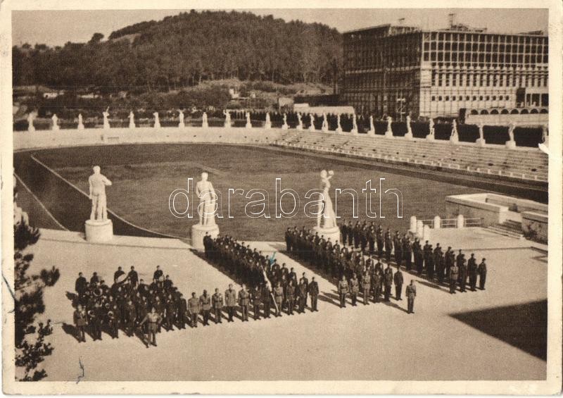1940 Magyar leventeszázad Olaszországban - 3 db régi katonai motívumlap: (1) A leventeszázad a Rákóczi induló vérpezsdítő hangjai mellett a Duce (Benito Mussolini) előtt díszmenetel Padovában, (2) Az "Ismeretlen Katona sírját" koszorúzzák Rómában, (3) A leventeszázad a "Foro Mussolinin" torna és táncbemutatót tart / Hungarian Paramilitary Youth Organization (Levente) in Italy - 3 pre-1945 military motive cards: (1) The Hungarian leventes parade march for Mussolini in Padua, (2) They lay wreaths on the Tomb of the Unknown Soldier in Roma, (3) They hold a gymnastics and dance presentation