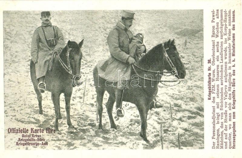Kriegsbildkarte Nr. 36. Der Personaladjutant des FZM. Wurm, Oberleutnant Baron Pawel-Ramingen, bringt mit seinem Husaren ein sechs Wochen altes Mädchen, das von flüchtenden serbischen Landleuten zurückgelassen und auf der Straße vor Valjevo aufgelesen wurde, ins Korps-Hauptquartier, wo man sich des Sauglings in humanster Weise annahm. Kriegshilfsbüro / WWI Austro-Hungarian K.u.K. and German military postcard, Lieutenant Baron Pawel-Ramingen, and his hussar bring a six-week-old girl, left behind by fleeing Serbian countrymen, to Corps Headquarters, where the infant was treated in the most humane way.