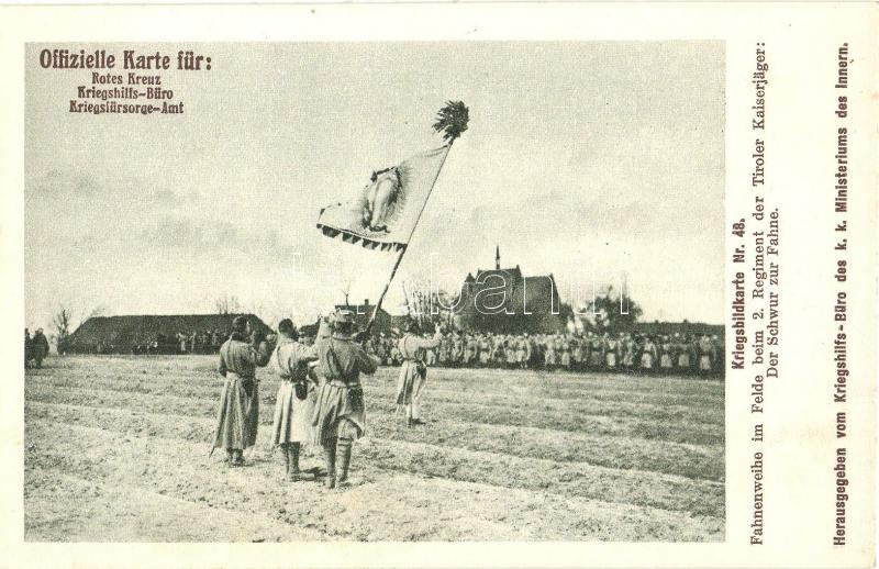 Kriegsbildkarte Nr. 48. Fahnenweihe im Felde beim 2. Regiment der Tiroler Kaiserjäger: Der Schwur zur Fahne. Kriegshilfsbüro / WWI Austro-Hungarian K.u.K. and German military postcard, Flag consecration of the 2nd Regiment of the Tyrolean Kaiserjäger at the field, the oath to the flag