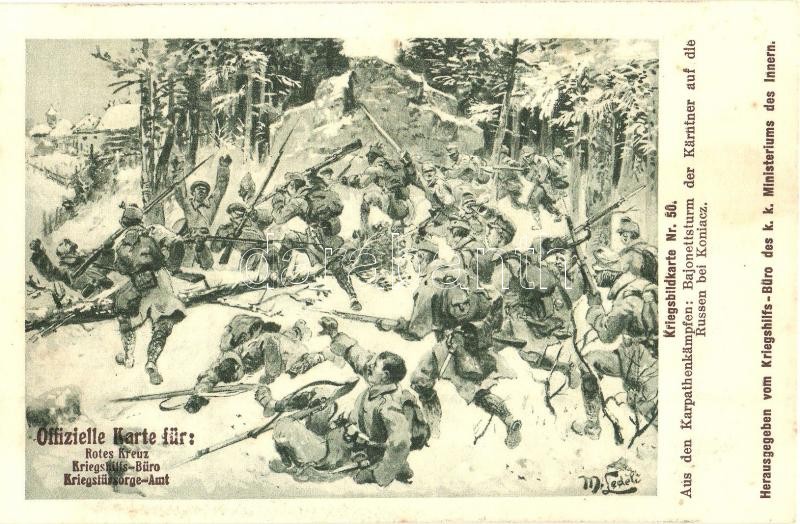Kriegsbildkarte Nr. 50. Aus den Karpathenkämpfen: Bajonettsturm der Kärntner auf die Russen bei Koniacz. Kriegshilfsbüro / WWI Austro-Hungarian K.u.K. and German military art postcard, Carinthians' bayonet attack on the Russians s: M. Ledeli