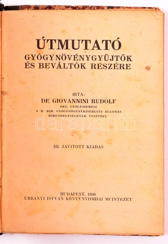 Leírás: De Giovanni Rudolf: Útmutató gyógynövénygyűjtők és beváltók részére. Bp., 1940. Urbányi István. Félvászon kötésben. 206p. Sok illusztrációval
