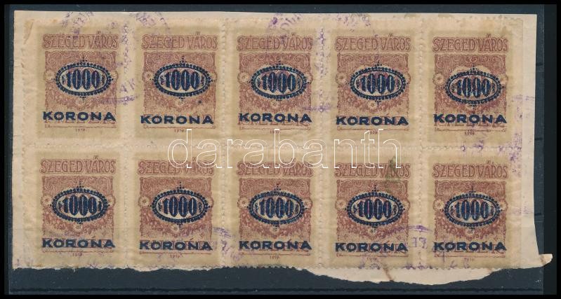 Szeged 1000K tízestömb okmánydarabon https://www.darabanth.com/hu/343-Gyorsarveres/343.0/Magyar-filatelia-es-postatortenet/Okmanybelyegek~500017/Szeged-1000K-tizestomb-okmanydarabon~II1923548