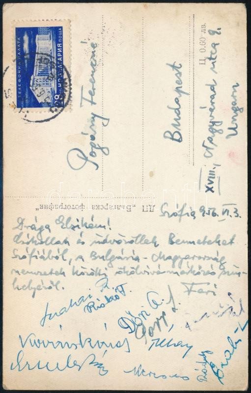 1956 Pogány Ferenc ökölvívó bíró képeslapja Szófiából Bulgária Magyarország nemzetek közötti ökölvívó mérkőzésről feleségének, számos aláírással, közte Papp László (1926-2003) későbbi olimpiai bajnok, edző és Dőry András (1930-2013) olimpiai bajnok ötödik helyezett, edző aláírásaival.
