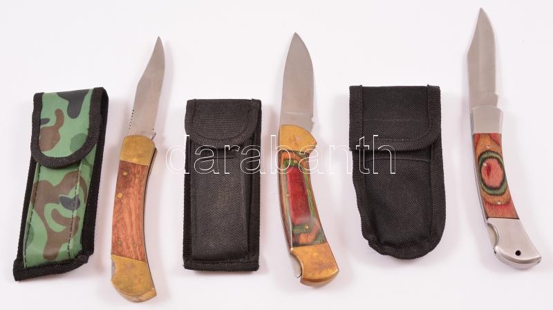 Leírás: 3 db különféle vadászkés, tokban, jó állapotban