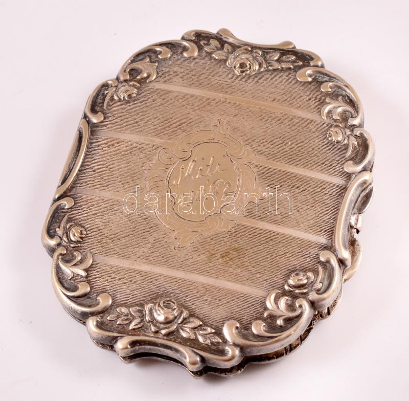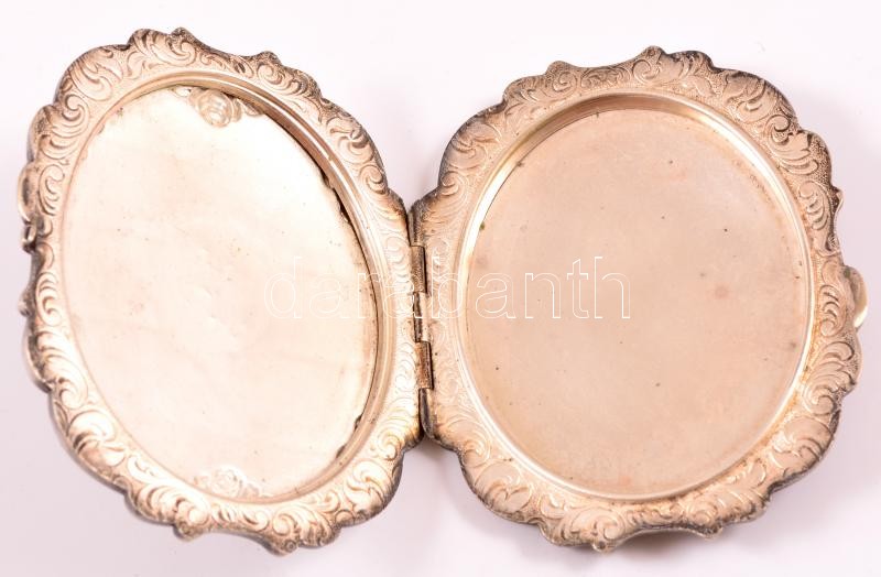 Leírás: Díszes alpakka zseb fényképtartó, "Miti 1.10.62" gravírozással, jelzés nélkül, 8x6 cm.