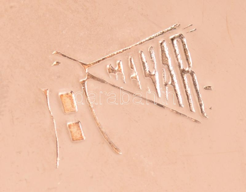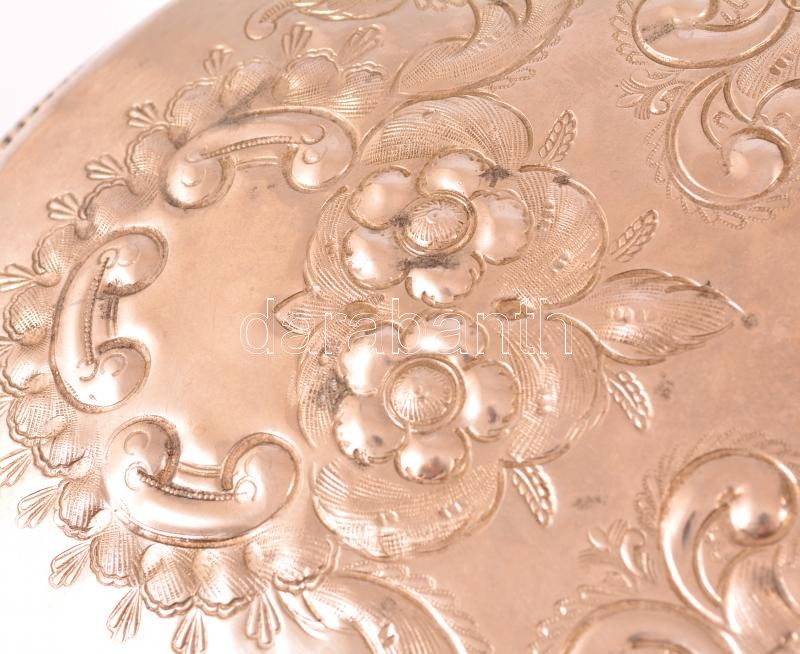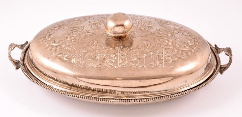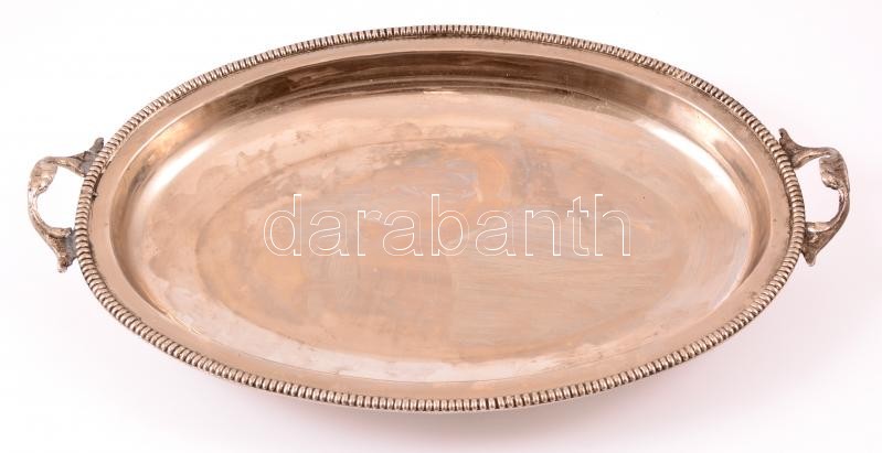 Leírás: Gazdagon díszített alpakka ételszervírozó, füleknél forrasztások, jelzett (Manar), 44×29 cm