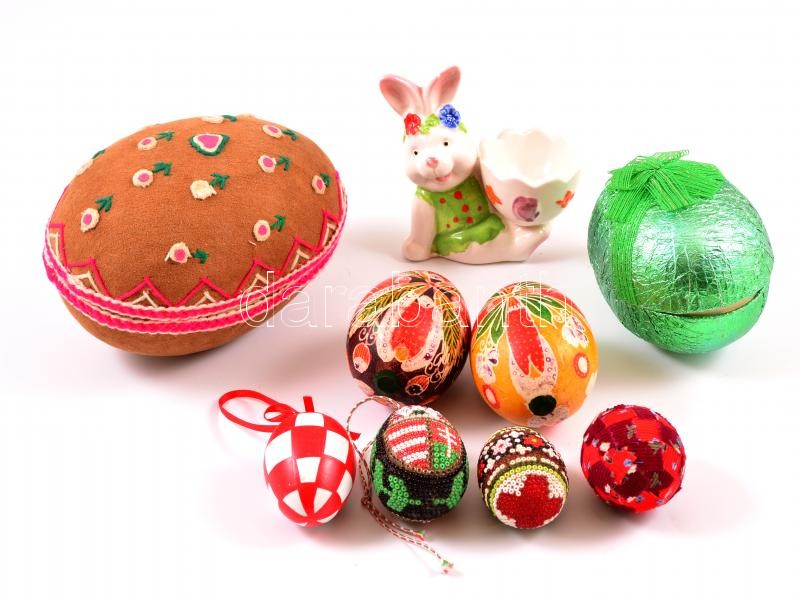 Leírás: Kis húsvéti tétel: 2 db kézzel festett libatojás, 2 db húsvéti gyöngy, 1 db porcelán nyuszis tojástartó, 2 db papírmasé tojás
