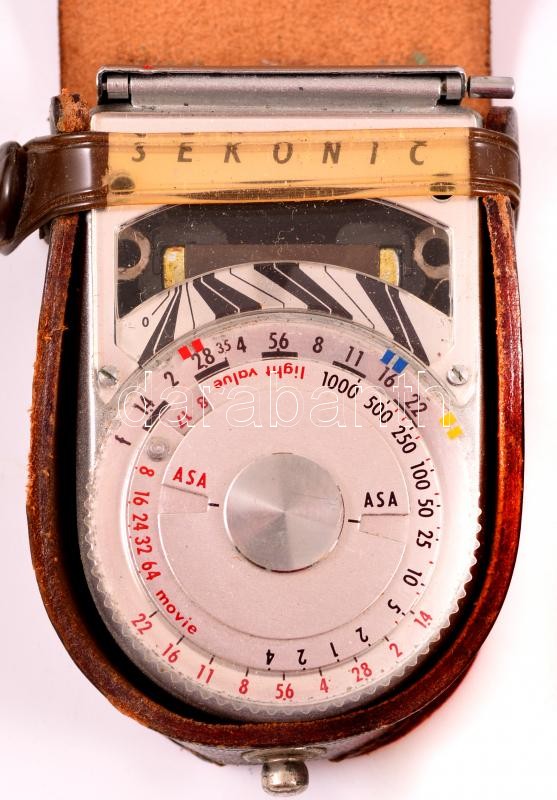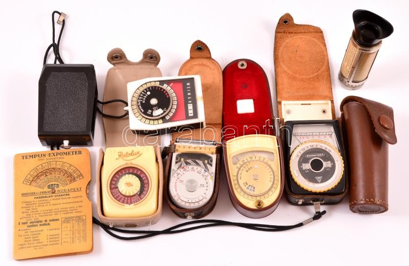 Vegyes régi fényképező kellék tétetel, összesen 8 db, fa dobozban, köztük: BEWI optikai megvilágításmérő, Werralux, Weimarlux, Sekonic, Rotolux, Leningrad fénymérők, önkioldó, HAFA expozíciós táblázat