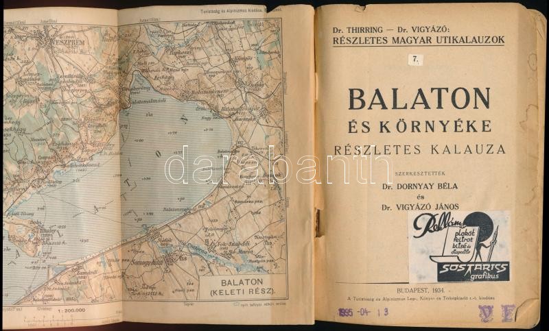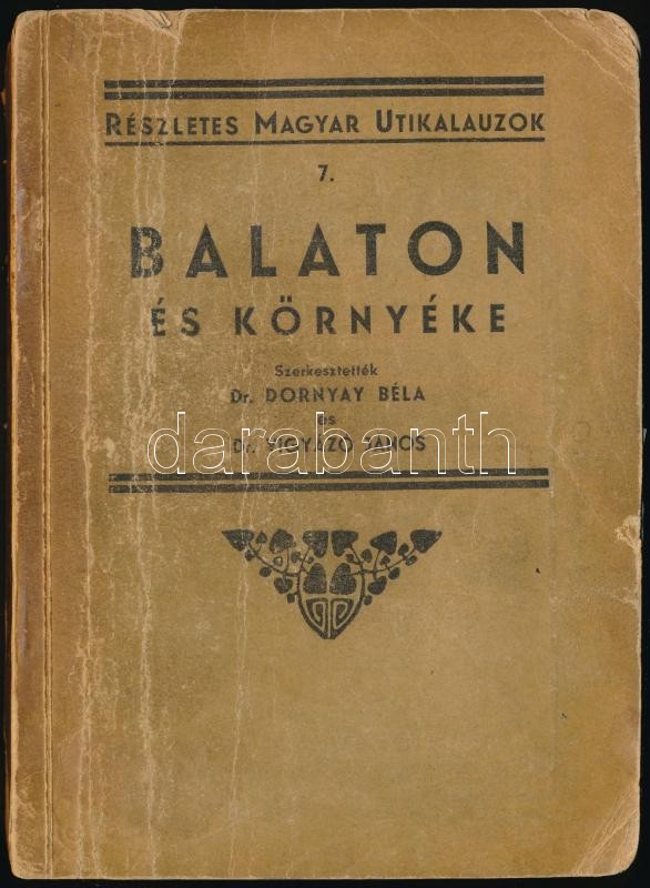 Leírás: Balaton és környéke részletes kalauza. Szerk.: Dr. Dornyay Béla-Dr. Vigyázó János. Részletes Magyar Utikalauzok 7. Bp.,1934, Turistaság és Alpinizmus, 426+6 p.+4 kihajtható térkép+6 kihajtható panoráma rajz. Kiadói papírkötés, kissé sérült borító