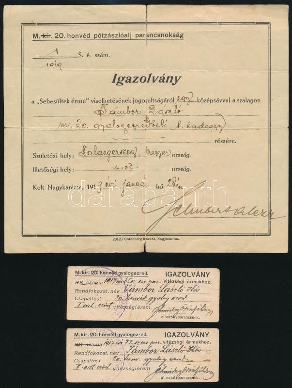 1917-1932 Katona kitüntetés igazolásai: I. és II. oszt vitézségi érem,... https://www.darabanth.com/hu/343-Gyorsarveres/343.0/Mutargy-papirregiseg-egyeb/Militaria~500028/1917-1932-Katona-kituntetes-igazolasai-I-es-II-oszt-vitezsegi-erem-Sebesultek-erme-val~II1936031
