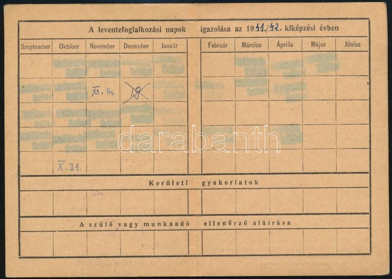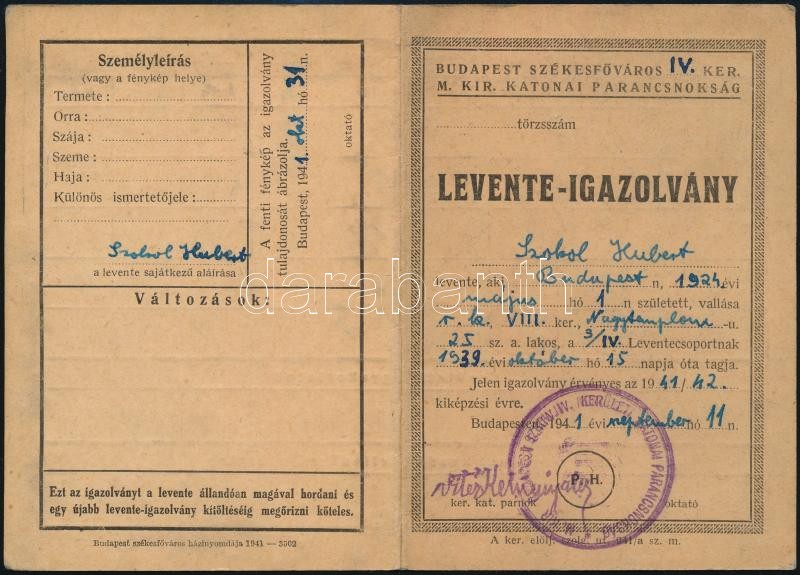 Leírás: 1941 Bp., Budapest Székesfőváros IV. Ker. M. Kir. Katonai Parancsnoksága által kiállított levente igazolvány