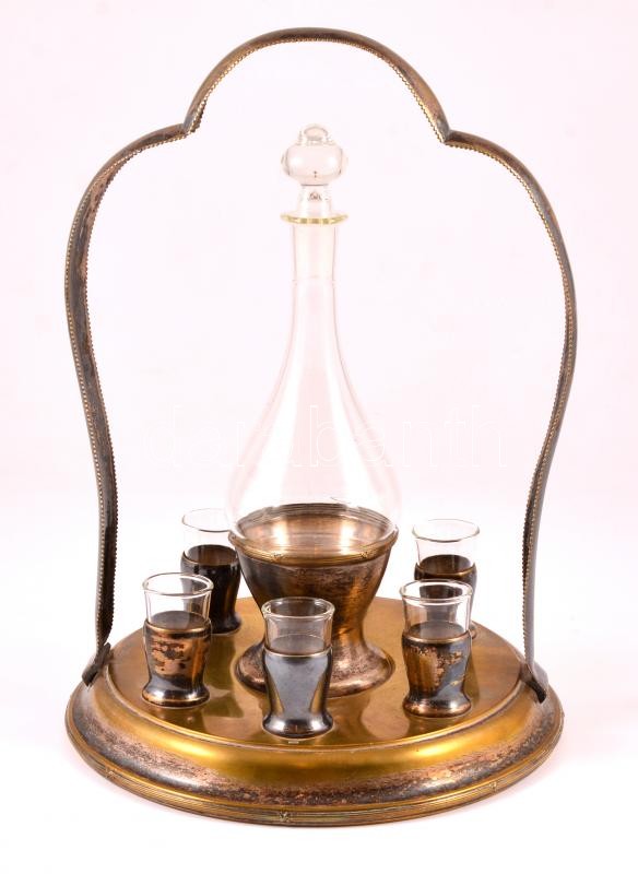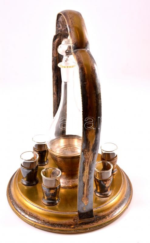 Leírás: Likőrös készlet. Ezüstözött réz tartó (kopott) üvegpoharakkal és likőrös/pálinkás üveggel m: 35 cm