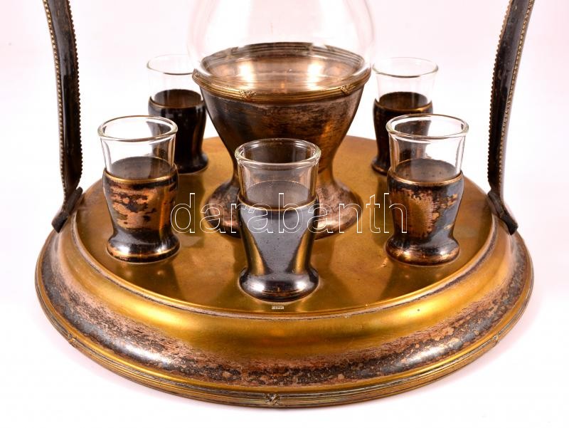 Likőrös készlet. Ezüstözött réz tartó (kopott) üvegpoharakkal és likőr... https://www.darabanth.com/hu/343-Gyorsarveres/343.0/Mutargy-papirregiseg-egyeb/Mutargyak-antikvitas~500005/Likoros-keszlet-Ezustozott-rez-tarto-kopott-uvegpoharakkal-es-likorospalinkas-uve~II1936409