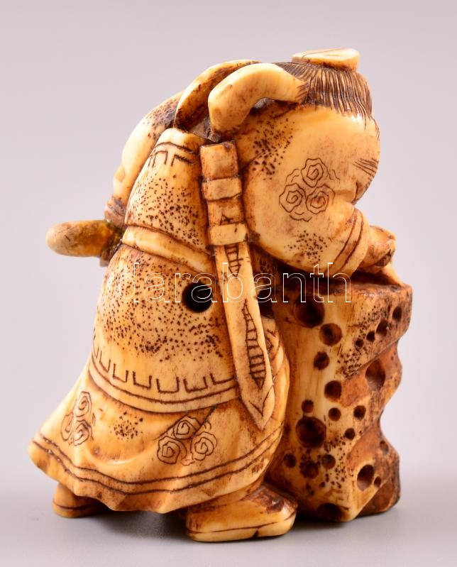 Leírás: XX. század eleje harcos necuke, faragott elefántcsont figura, jelzés nélkül, m: 5 cm