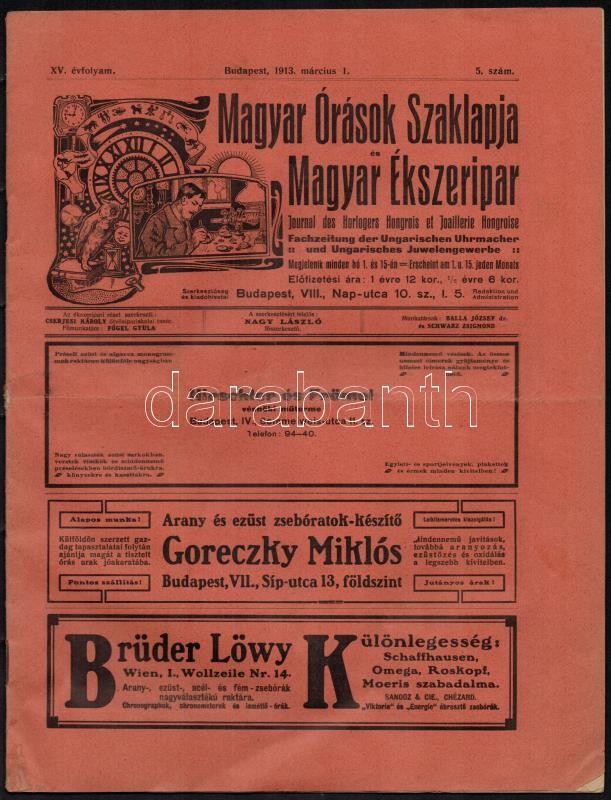 1913 Magyar Órások Szaklapja és Magyar ékszeripar. XV. évf. 5. sz., 1913. március 1. Szerk.: Nagy László. Papírkötés, az egyik sarkán foltos, sérült, IV+97-120 p.