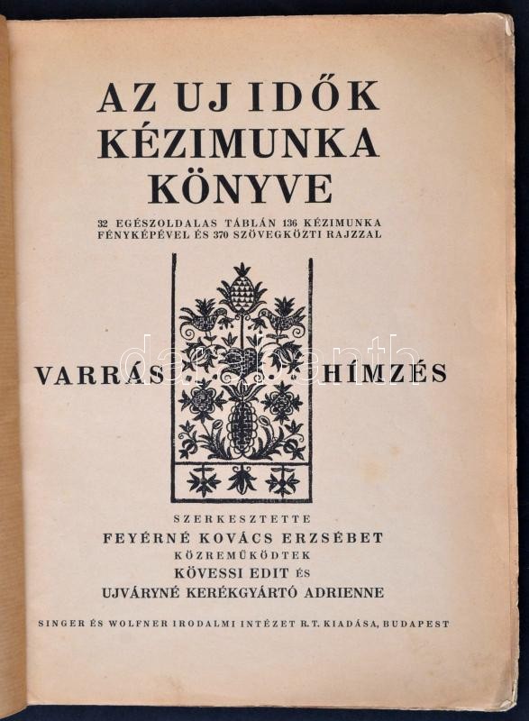1935 Az Új Idők kézimunka könyve: Varrás és hímzés. Szerk.: Feyérné Kovács Erzsébet. Bp.,1935, Singer és Wolfner, 72 p+XXXII t. Kiadói papírkötés, szakadt borítóval, kissé sérült kötéssel.