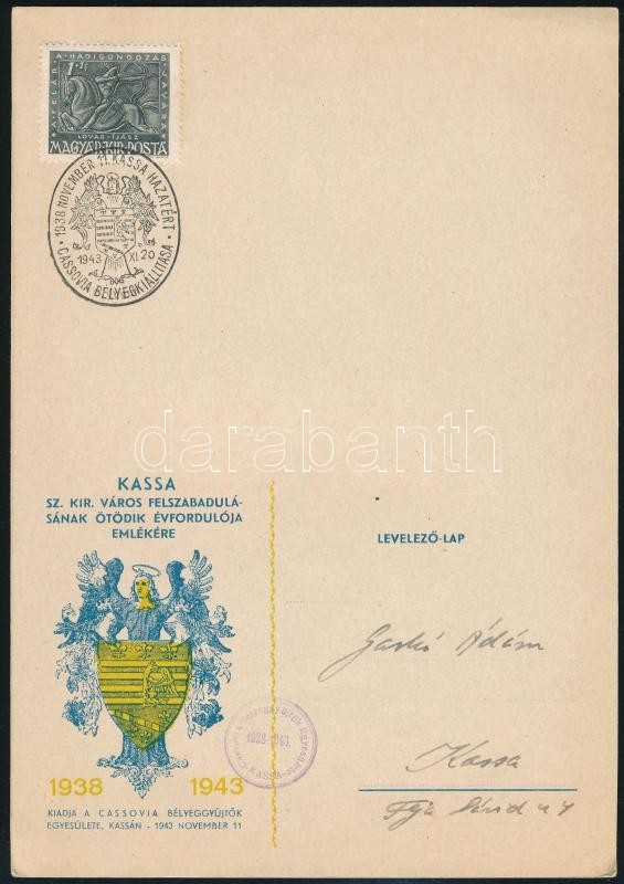 Leírás: 1943 Kassa szab. kir. város felszabadulásának ötödik évfordulója emlékére kiadott levelezőlap