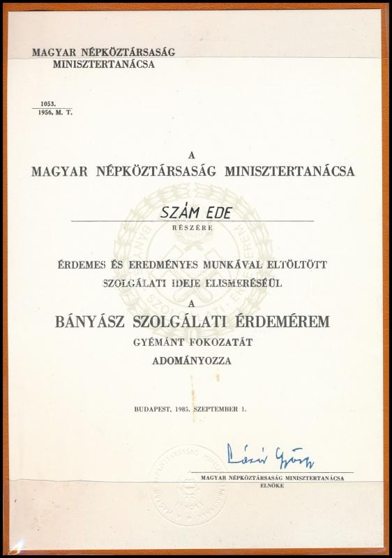 Leírás: 1985 Bányász szolgálati érdemérem adományozó oklevél