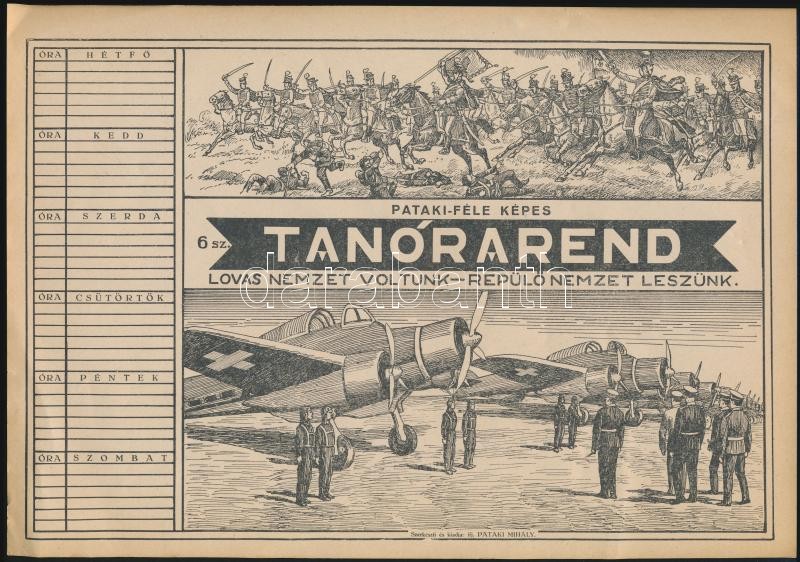 cca 1900 Pataki-féle képes tanórarend, katonai motívummal https://www.darabanth.com/hu/343-Gyorsarveres/343.0/Mutargy-papirregiseg-egyeb/Nyomtatvanyok~500030/cca-1900-Pataki-fele-kepes-tanorarend-katonai-motivummal~II1935060