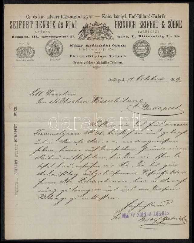 1889 Bp., Seifert Henrik és Fiai Cs. és kir. udvari tekeasztal gyár fe... https://www.darabanth.com/hu/343-Gyorsarveres/343.0/Mutargy-papirregiseg-egyeb/Okmanyok~500018/1889-Bp-Seifert-Henrik-es-Fiai-Cs-es-kir-udvari-tekeasztal-gyar-fejleces-levelpapirjara-C3~II1935747