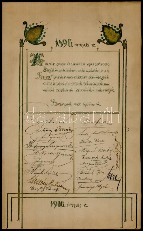 Leírás: 1906 Bp., M. kir. posta és távírda igazgatóság által 10 éves jubileum alkalmából készített emléklap aláírásokkal