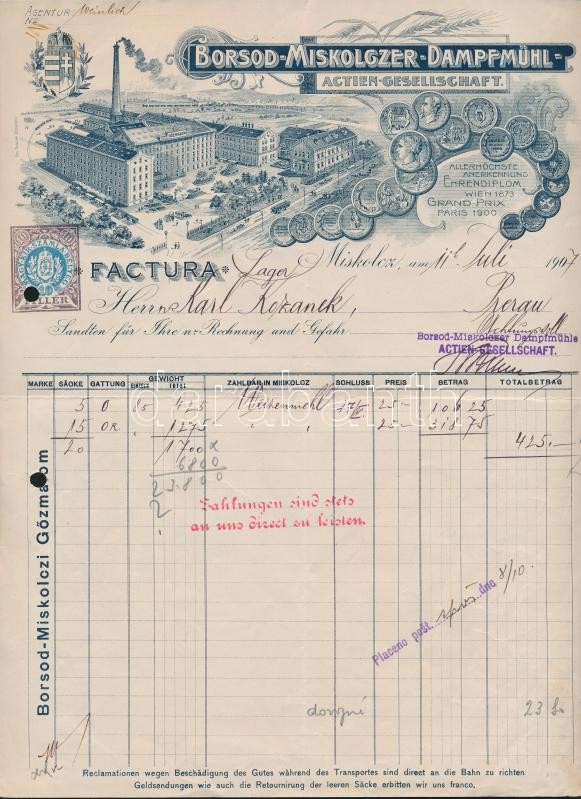 Leírás: 1907 Miskolc, Borsod-Miskolczer-Damppfmühl Actien-Gesellschaft díszes fejléces számlája, rajta a gyár látképével