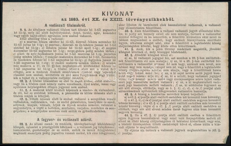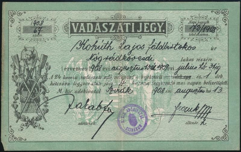 Leírás: 1908 Nógrádkövesd, vadászati jegy, Kohuth Lajos földbirtokos részére, hajtásnyommal, pecséttel.