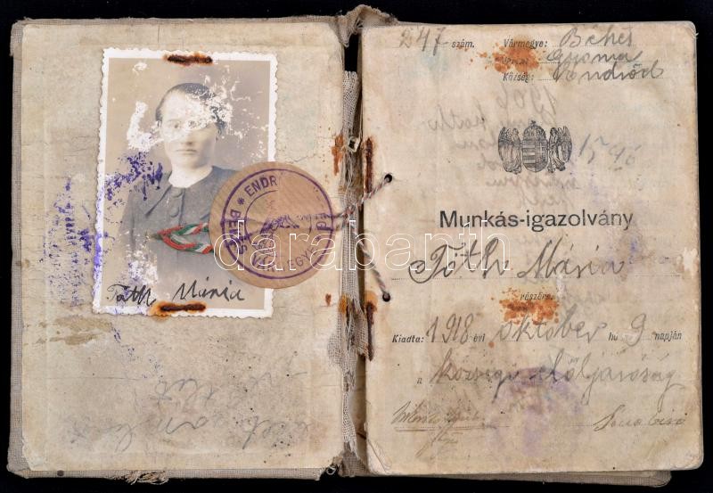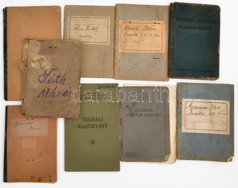 1913-1946 Vegyes okmány tétel, 9 db. Közte munkásigazolványokkal, cselédkönyvekkel, az egyik munkásigazolvány kiskunfélegyházai, a többi gyomaendrődi, egy kivételével mindegyik fényképpel, valamint egy gépjárművetői forgalmi engedély, egy fényképes ügynöki igazolvány, valamint Tanárok Özvegyeit és Árváit Segítő Országos Egyesület tagsági igazolványával. Változó állapotban.