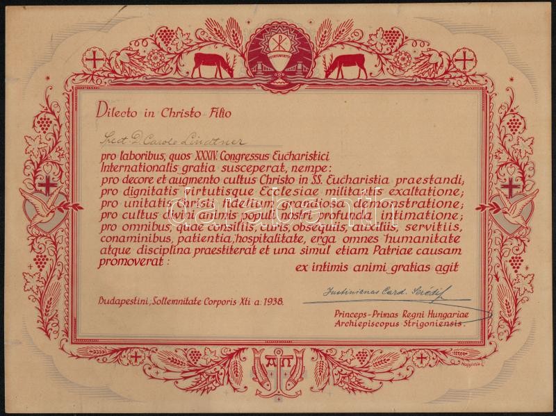 1938 Serédi Jusztinián bíboros nyomtatott aláírásával ellátott dekoratív oklevél, amelyben megköszönik a 38. Eucharisztikus Kongresszus sikeres lebonyolításában való részvételt