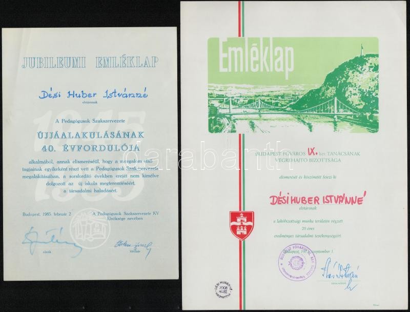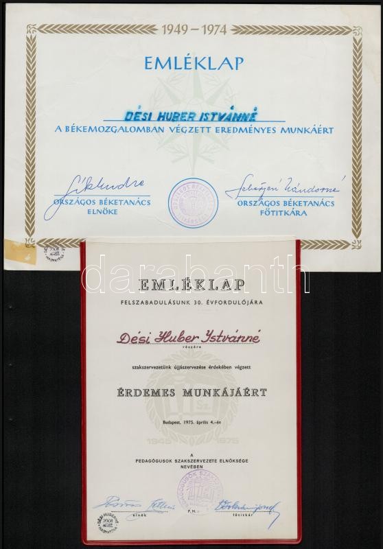 Leírás: 1975 Dési Huber Istvánné okmányai, 4 db emléklap