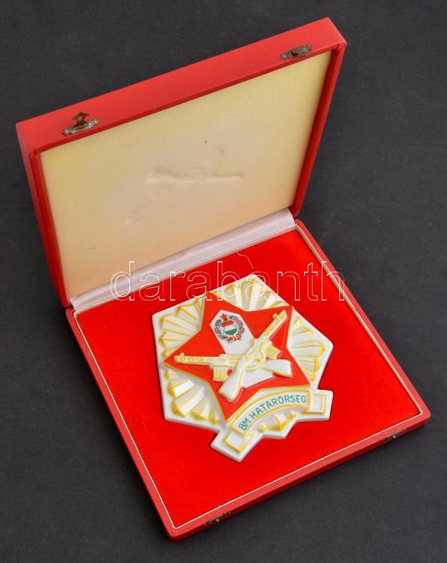 Leírás: Hollóházi BM porcelán emlékplakett, kézzel festett, jelzett, apró kopásokkal, díszdobozban, hozzá 7 db felvarró