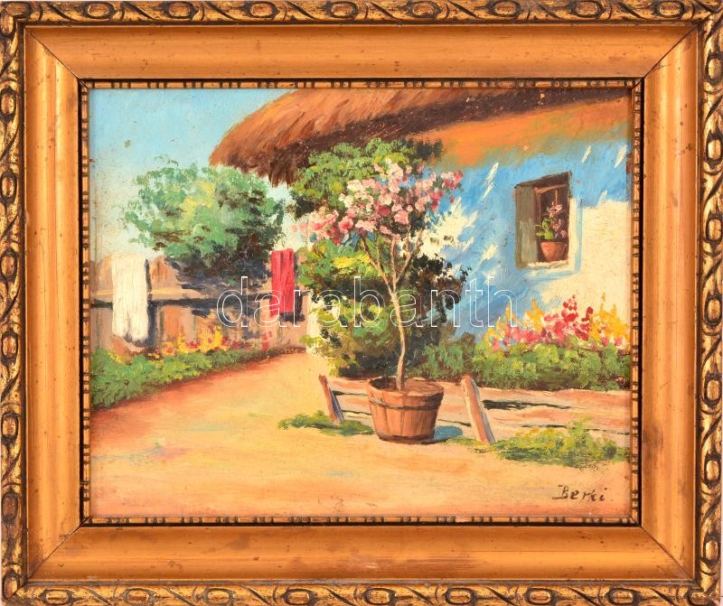Berki jelzéssel: Házudvar részlet. Olaj, karton, keretben, 21×26 cm https://www.darabanth.com/hu/344-Gyorsarveres/344.0/Festmenyek-es-grafikak/Festmenyek-es-grafikak~2/Berki-jelzessel-Hazudvar-reszlet-Olaj-karton-keretben-21C39726-cm~II1943652