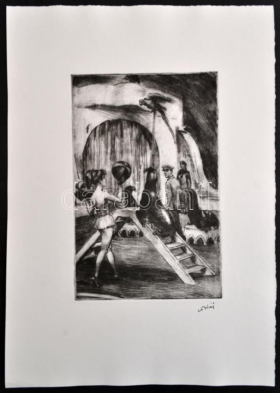 Leírás: Biai-Föglein István (1905-1974): Cirkusz. Rézkarc, papír, jelzett (bélyegzős), 29×19 cm
