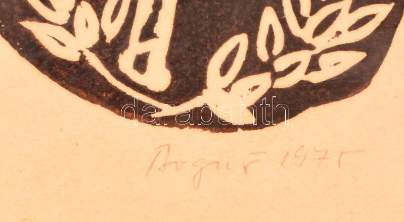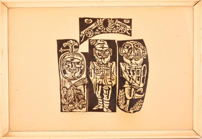 Leírás: Bognár Zoltán (1924-1992): A császár katonái. Linó (próbanyomat), papír, jelzett, üvegezett keretben, 36×55 cm