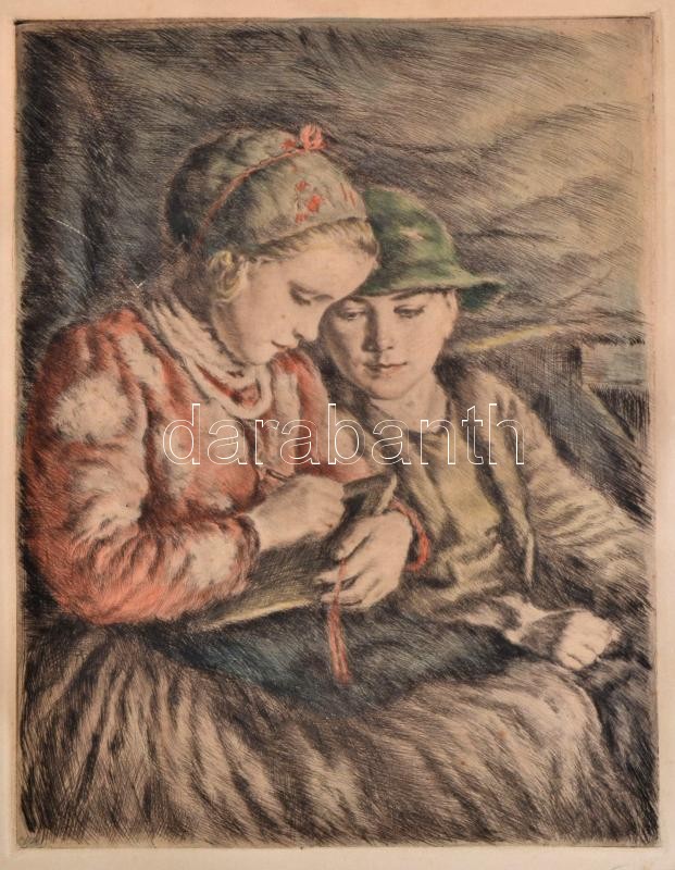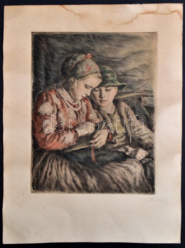 Leírás: Glatz Oszkár(1872-1958)-Prihoda István (1891-1956): Betűvetés, színezett rézkarc, papír, jelzett, foltos, 34,5×25,5 cm