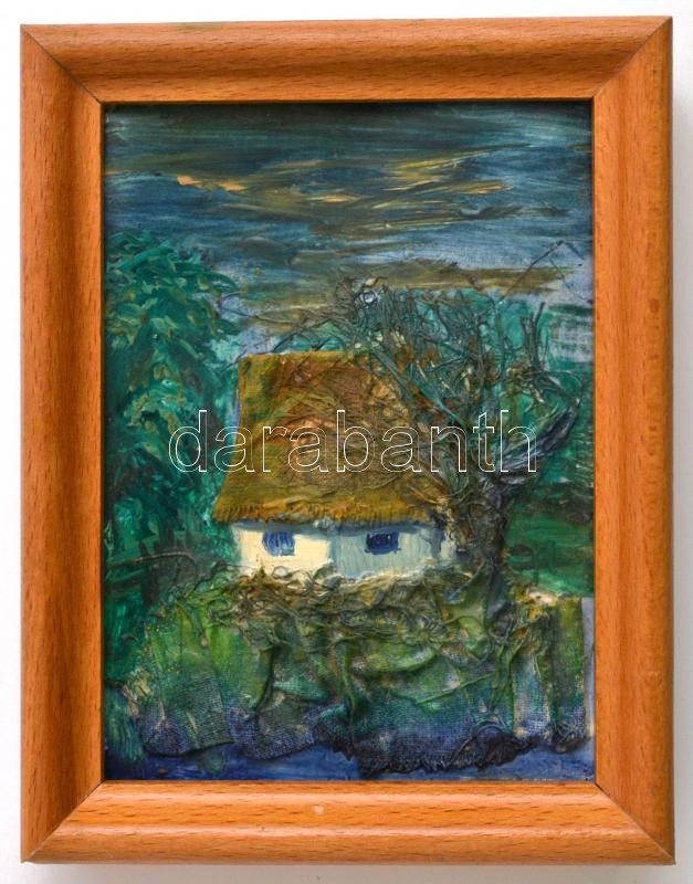 Leírás: Jelzés nélkül: Táj kunyhóval. Kollázs, karton, keretben, 14×10 cm