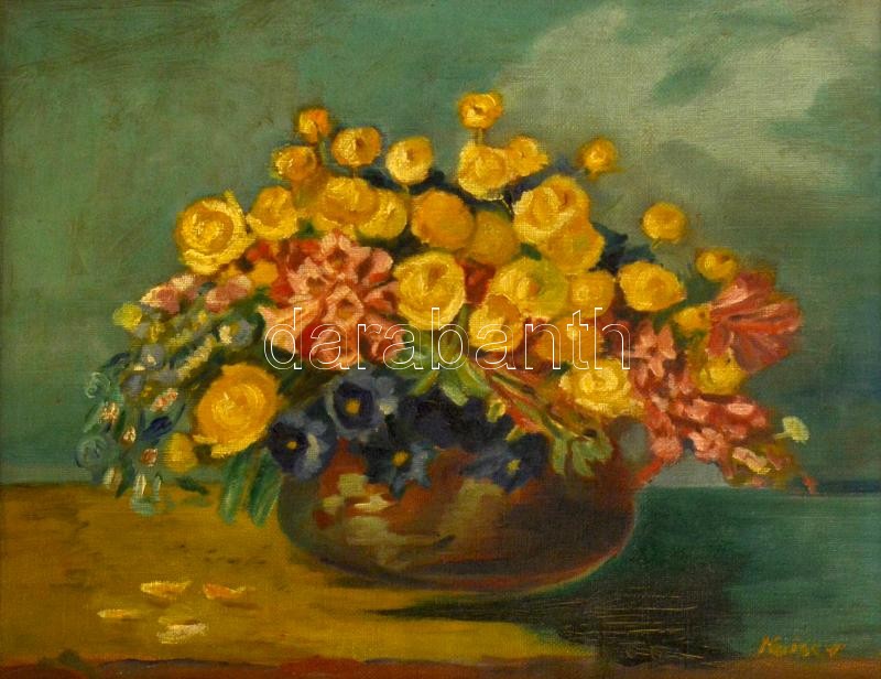 Leírás: Kaisler jelzéssel: Virágcsendélet. Olaj, vászon, keretben, 35×45 cm