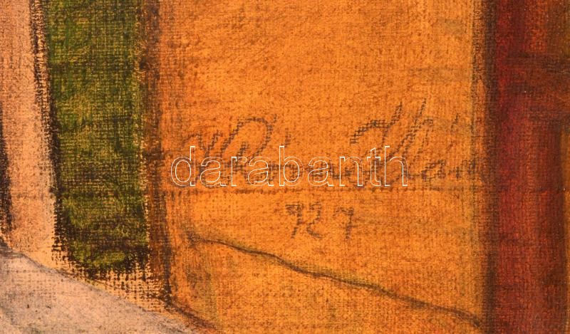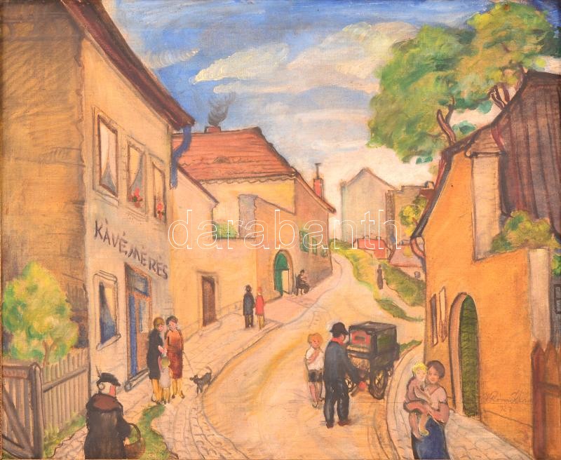 Leírás: Kliené Róna Klára (1901-1987): Ív ucca 1927 (Tabán). Olaj, vászon (lyukas), jelzett, sérült keretben, 55×68 cm