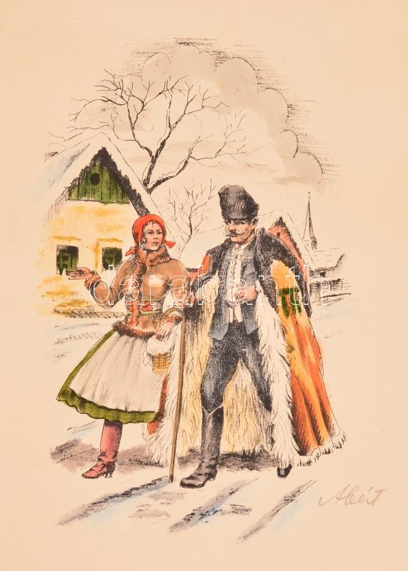 Leírás: Olvashatatlan jelzéssel: Falusi séta. Színezett litográfia, papír, felcsavarva, 42×30 cm