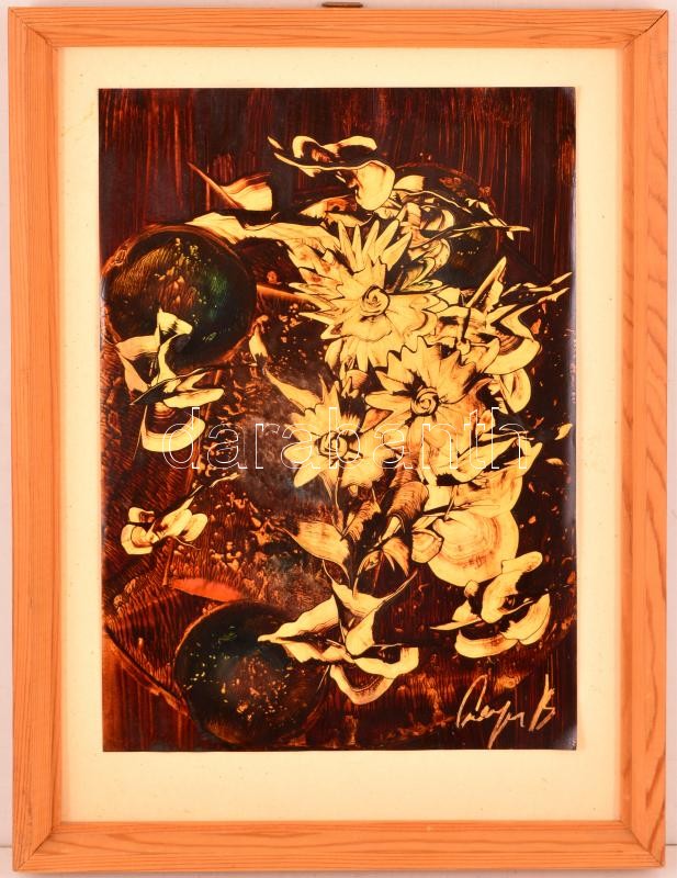 Leírás: Olvashatatlan jelzéssel: Virágok. Olaj, papír, keretben, 29×21 cm